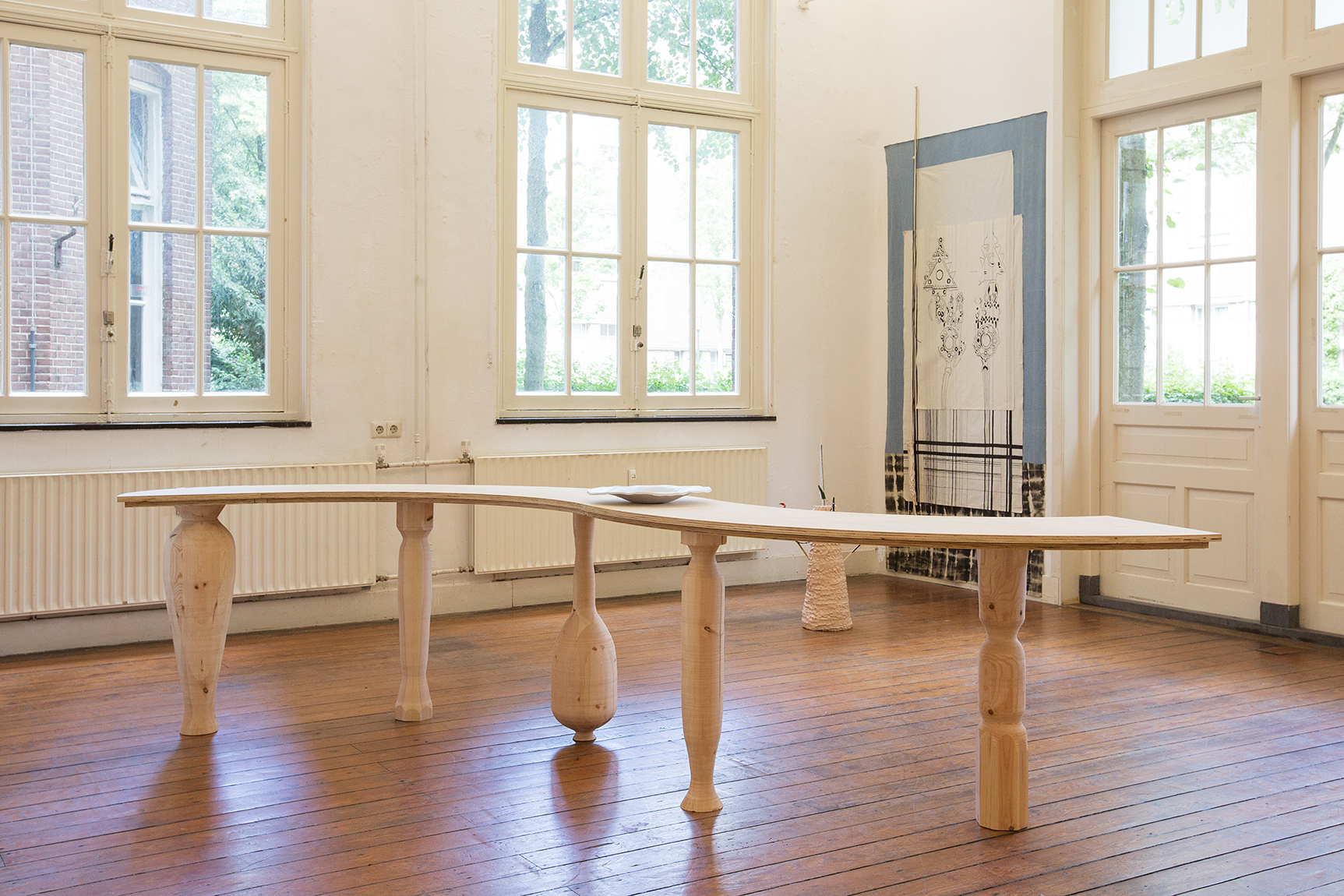 The slight and subtle changes in form find their origin in pottery, and refer to the transformation of one shape into the next. The medative variations in the shape of the table legs are closely related