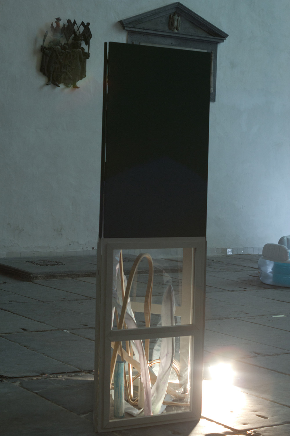 This installation was the result of a fascination with the transitory nature of light and how light can create shape within a limited period of time. It is partly made in my former studio (an ex-school building) then moved and finished in the building of the Old Church where the work was on display.